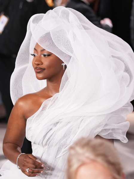 Tems’ white Oscars look had people wondering if her fashion statement was too much for a packed theater. (ALLISON DINNER/EPA-EFE/Shutterstock)