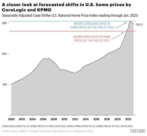 The chart below shows the range between the most bullish 2023 forecast (via CoreLogic) and the most bearish 2023 forecast (via KPMG).