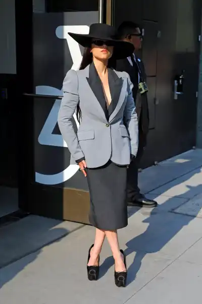 Jenna also attended two more screenings at different cinemas. At the first, she tried on an avant-garde business suit in shades of gray by Willy Chavarria and satin Christian Louboutin shoes reminiscent of the shoes of Bratz dolls. The look was completed with a black wide-brimmed hat, sunglasses and minimalist jewelry.